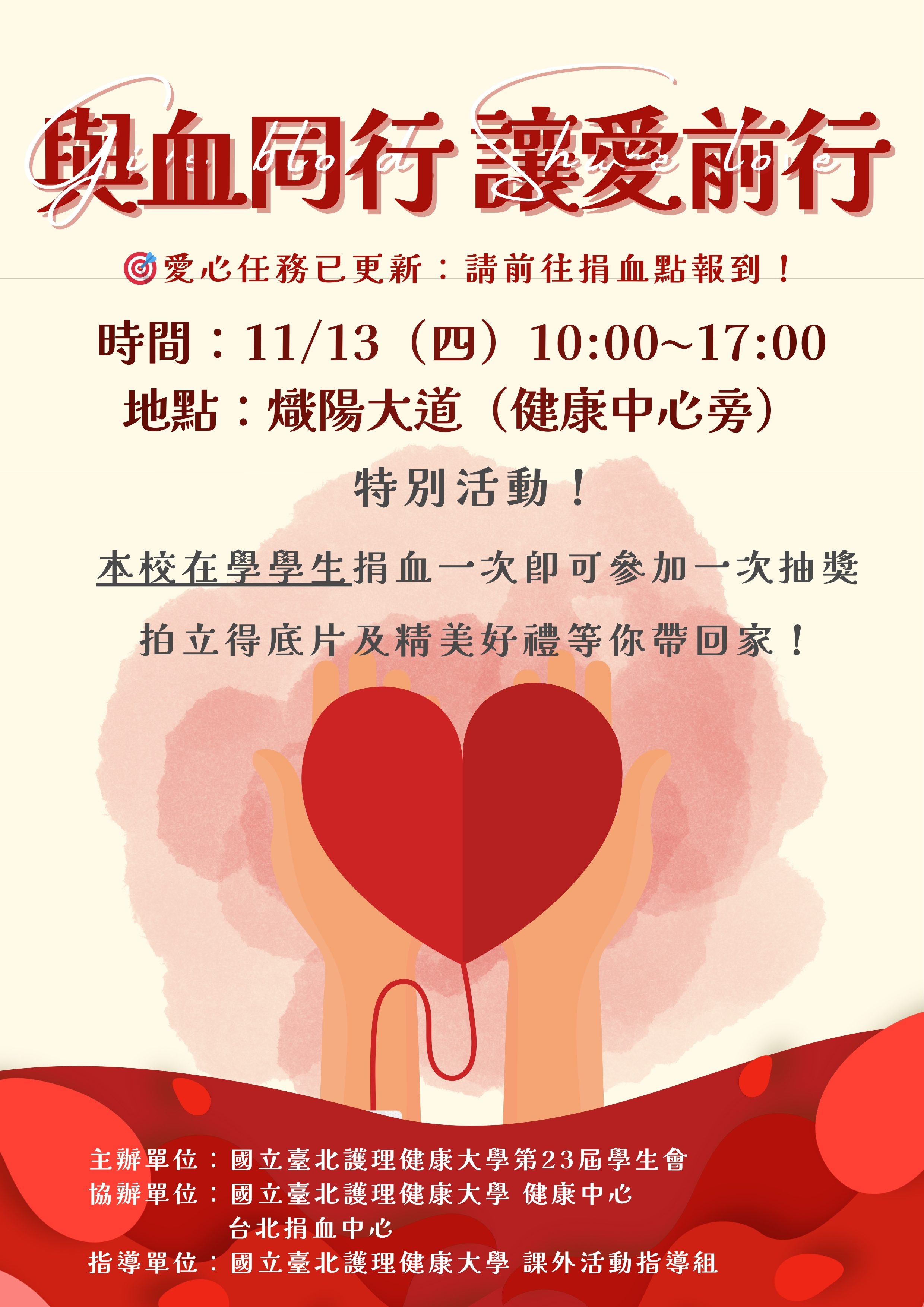 誠摯邀請參與11月13日「捐血活動」時間10點-17點,於健康中心旁