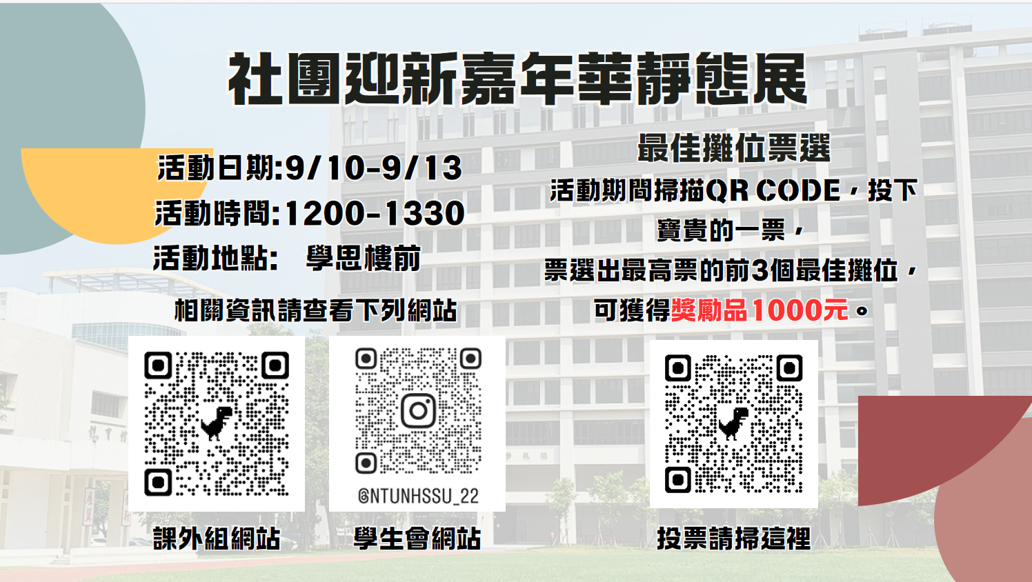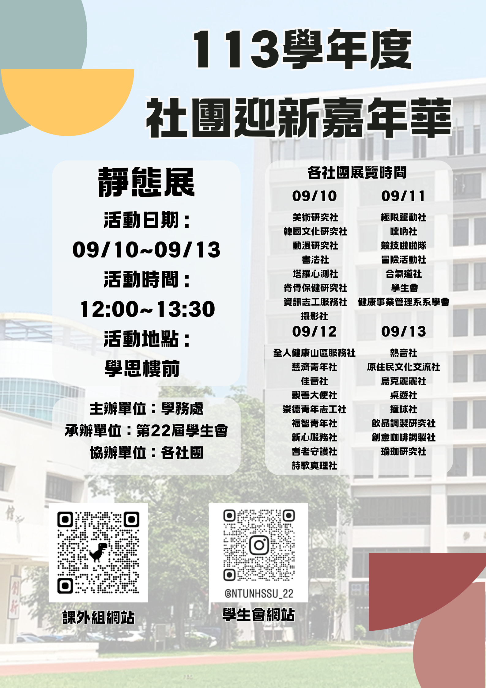 歡迎同學參與113學年度「社團迎新嘉年華」活動,靜態展9月10日至9月13日,中午12點至13點30分,學思樓前