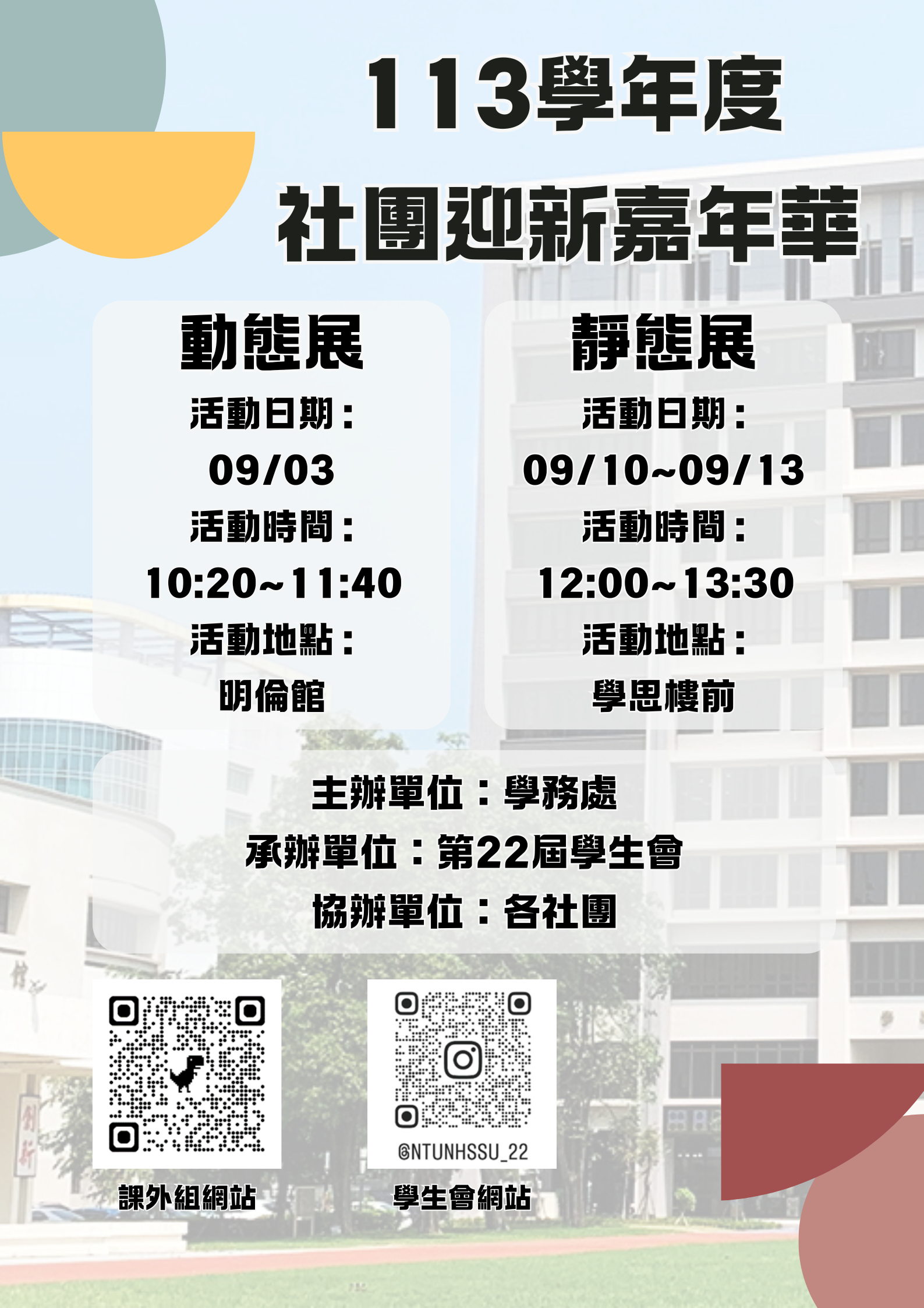 歡迎同學參與113學年度「社團迎新嘉年華」活動,動態展9月3日早上10點20分,明倫館